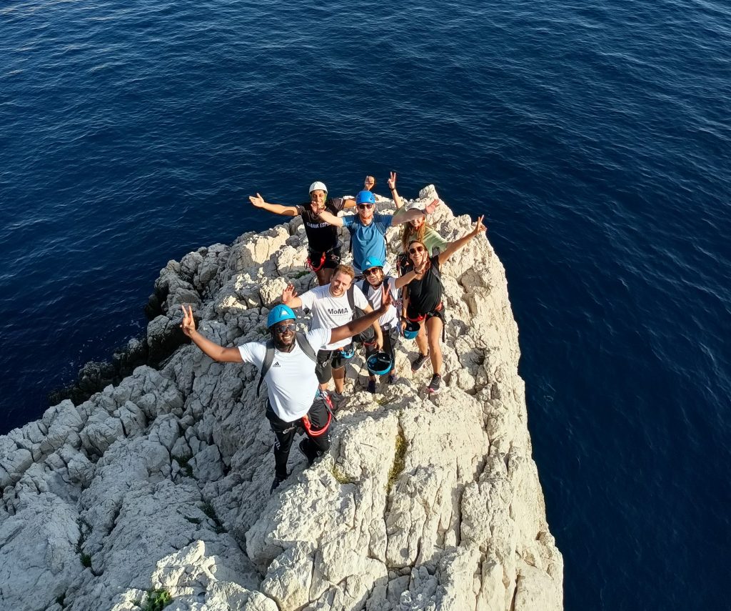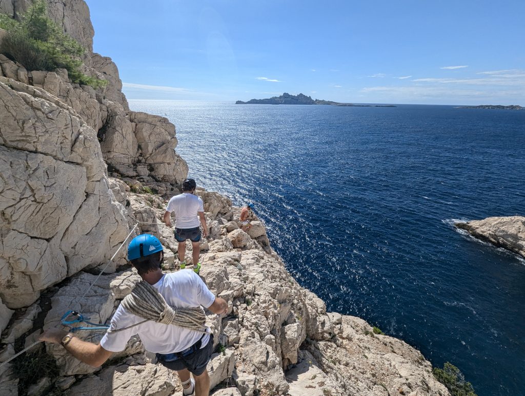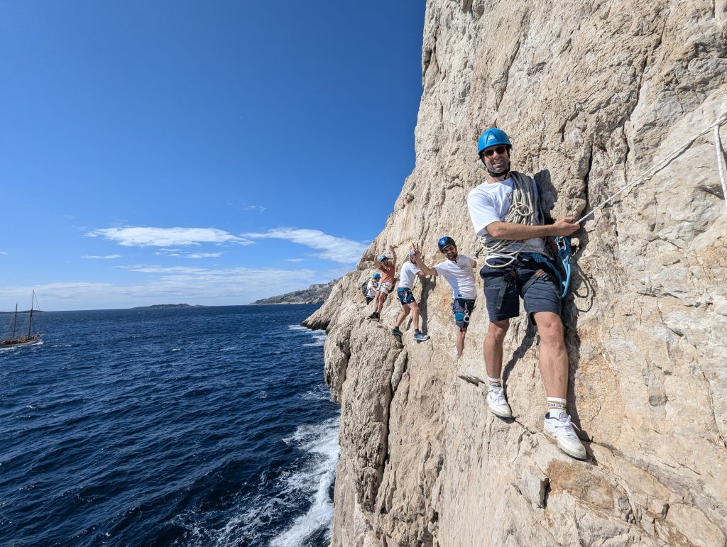Le parcours du Tour du Bec séduit par son caractère varié. On avance sur des vires, on franchit de petits ressauts rocheux, on découvre les sensations de la hauteur, tout en restant dans une logique progressive et encadrée. Cette activité permet de sortir des sentiers habituels et d’entrer dans le paysage des Calanques de manière plus immersive.